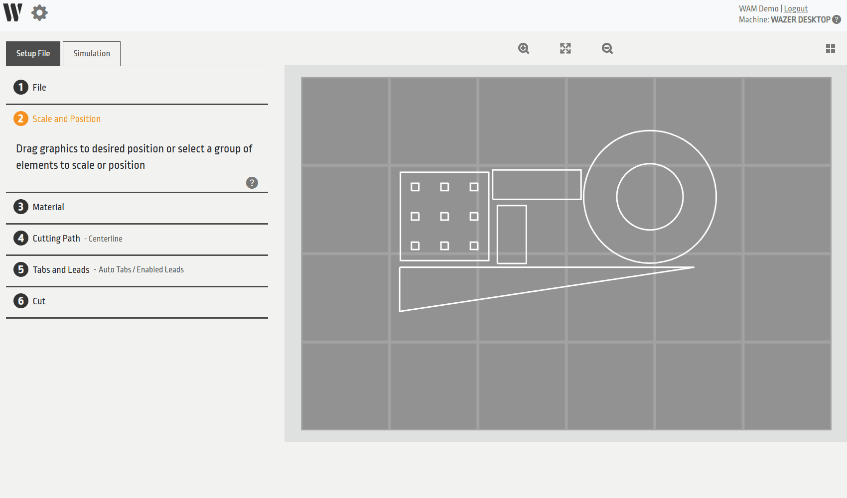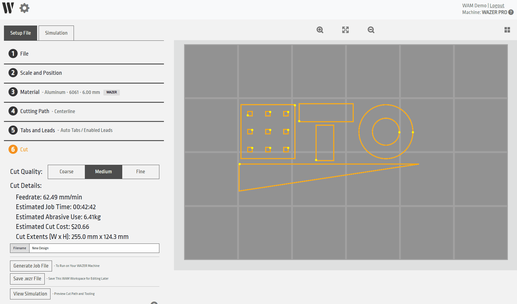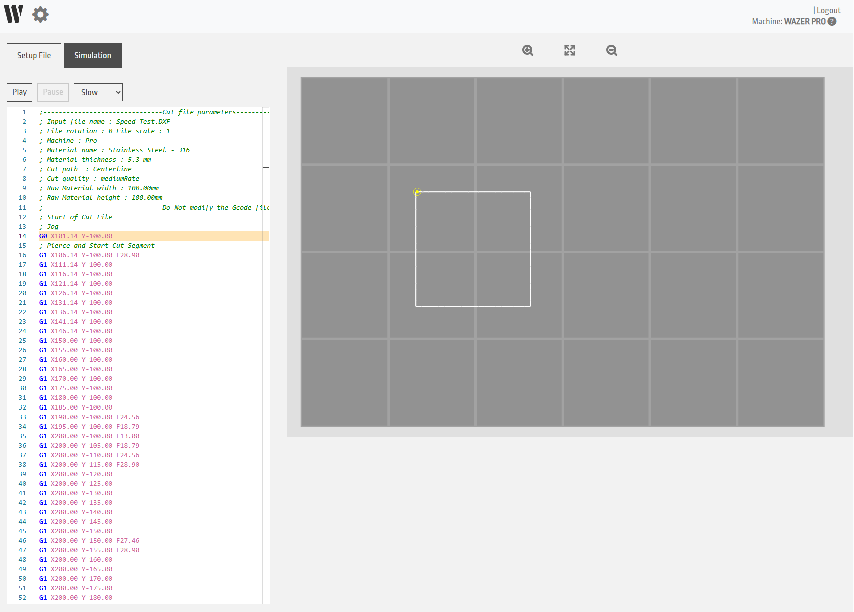 Another substantial change to WAM V2.2 is the addition of a “Simulation” sub menu. Upon finishing the setup of your cut, you may now go to this new menu that will allow you to view an abbreviated version of the gcode and also simulate the cutting path of the entire file. We suggest that you try this out before generating your gcode file for your WAZER, especially on more complex files. This sub menu is optional, so use it only if you feel comfortable.