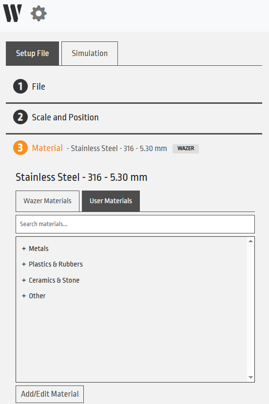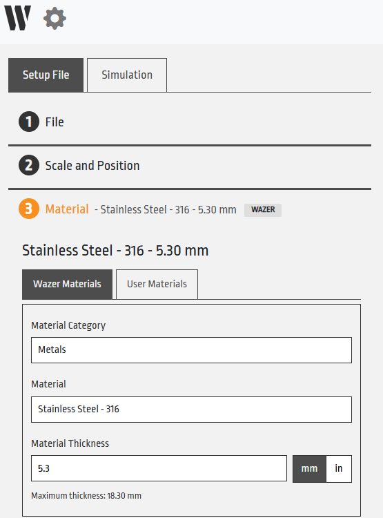 The WAZER material selection menu has been largely overhauled in WAM V2.2. It has been converted from a predefined set of discrete material thickness selections, to a menu where you type in the exact thickness of your material. No longer do you need to select the closest thickness that exists in our database or create your own material to fill in the gaps! Just select the material you are cutting and type in exactly the material thickness you have on hand. WAM will do the precise calculations for any thickness.