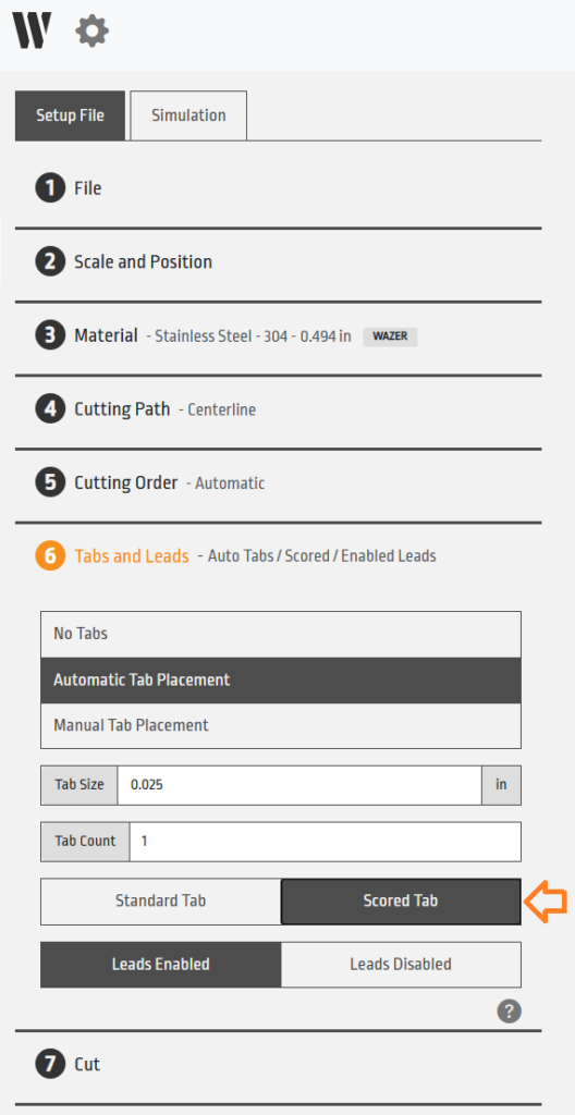 Enhance your post-processing efficiency with our new “Scored Tabs” feature found within the “Tabs and Leads” menu. This feature creates a partial cut (or “score”) on the top surface of the tab, allowing for a much cleaner break during de-tabbing.