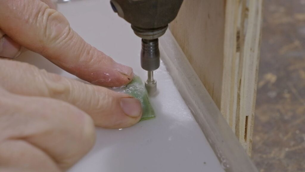 In a traditional stained glass workflow, each piece is typically scored and cracked by hand, refined on a grinder, and adjusted repeatedly until it fits within the pattern. Pask began this way, building a simple water-cooled grinding setup with a rotary tool and diamond bit. While effective, he quickly acknowledged that “although it works well, I wouldn’t say that it’s a quick process”