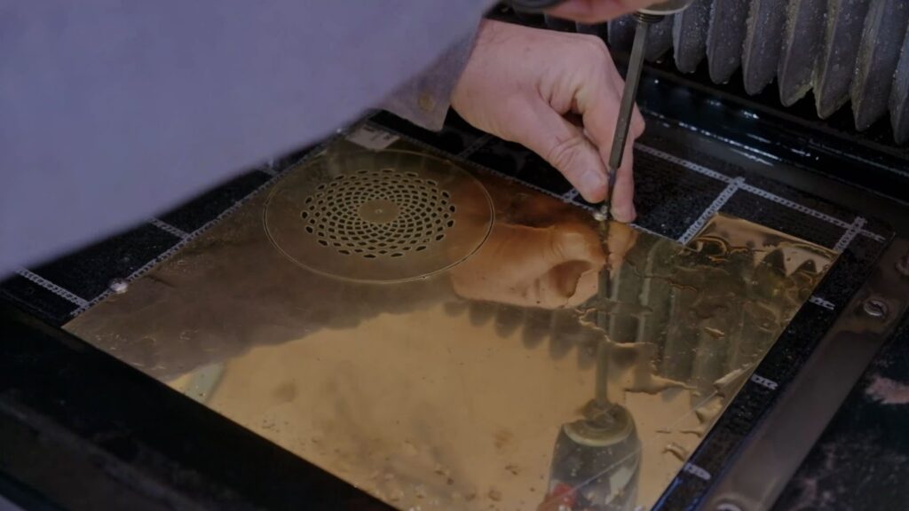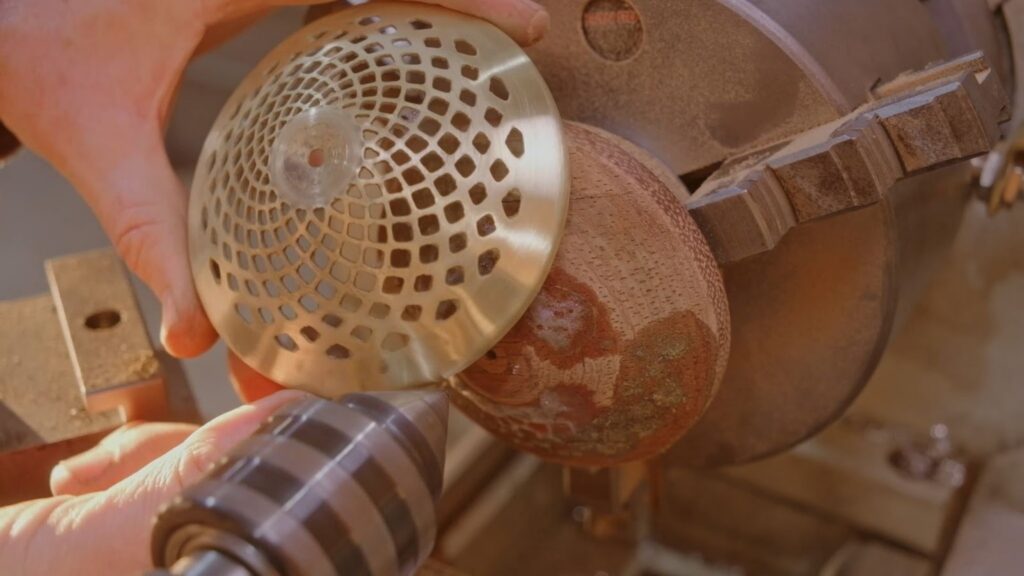 Beyond glass, the lamp required a structural brass gallery at the top. Pask cut this component from 1mm brass sheet using WAZER Pro, then formed it using custom wooden dies. He remarks simply that