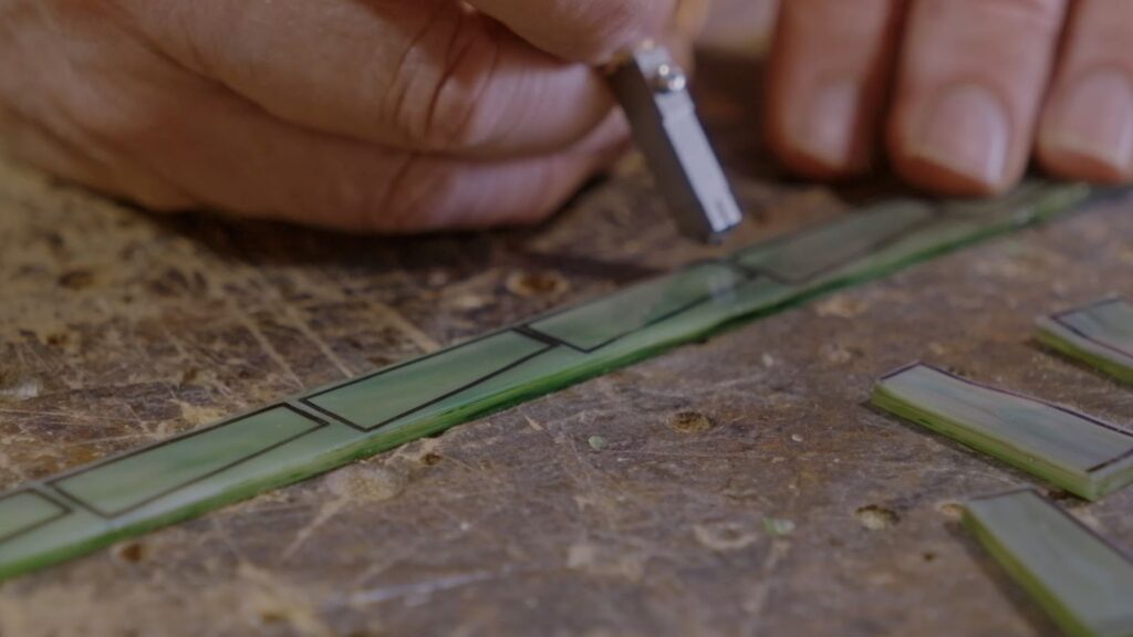 Rather than copying a floral Tiffany design, Pask gravitated toward more geometric patterns, explaining that he was drawn to their structure while still acknowledging that “they’re all made up of a crazy amount of tiny pieces of glass”.
