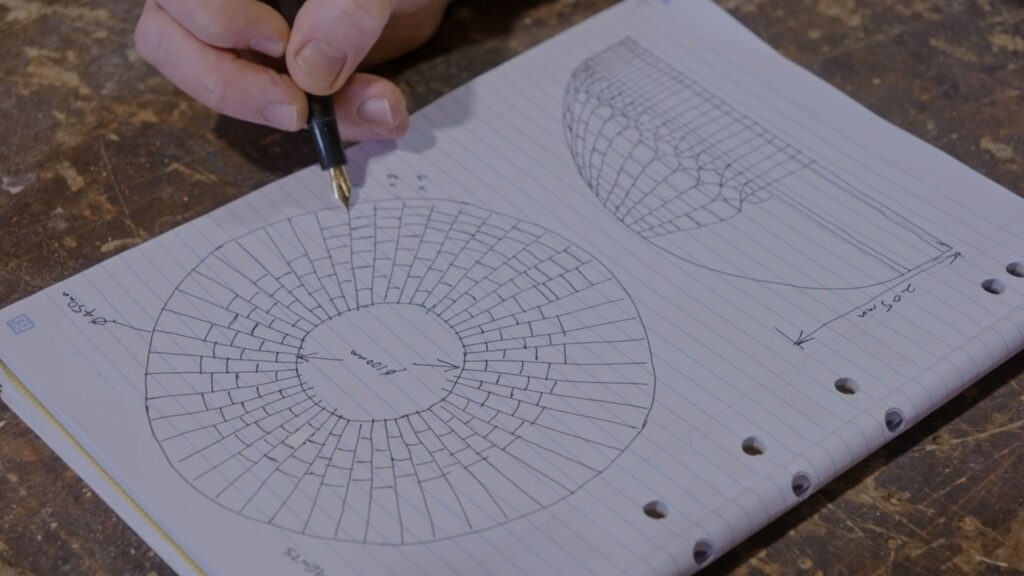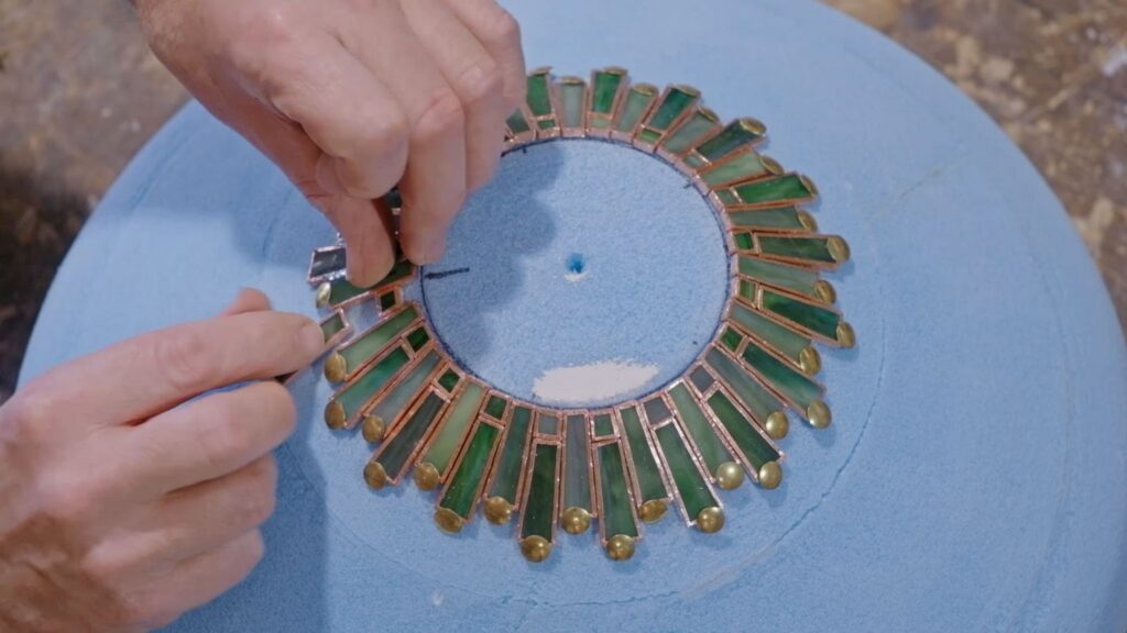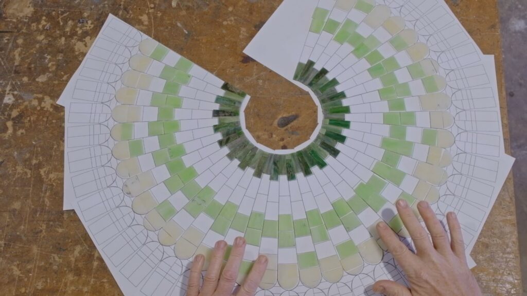 He began by shaping a foam mold on the lathe, later coating it in plaster to prevent heat damage during soldering and to provide a stable surface for marking the pattern. The design was laid out directly on the form, transferred to paper, and refined into repeatable tile shapes. At this stage, the scale of the project became clear when he counted approximately 820 individual glass tiles in the full design, all of which would eventually need edge grinding and copper foil.