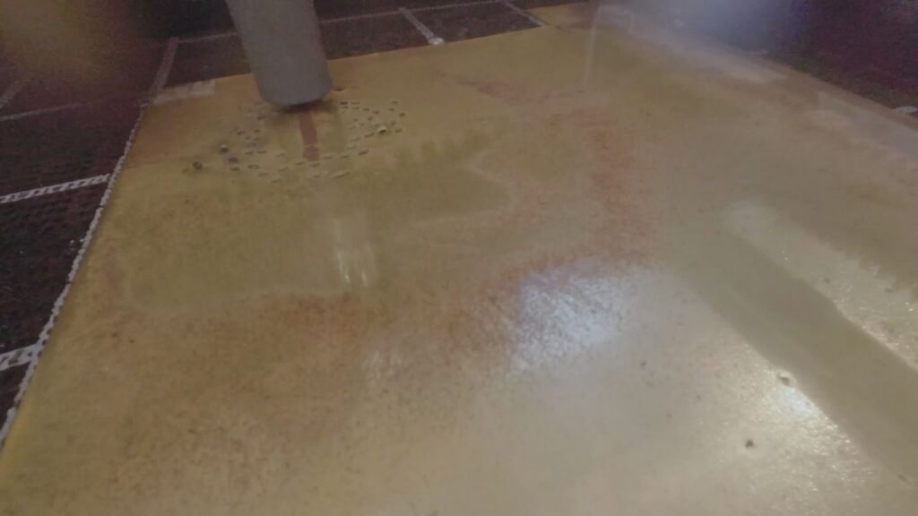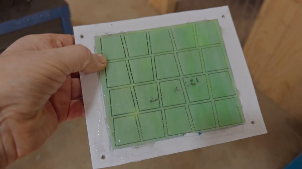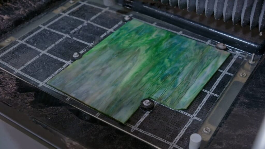That shift made it feasible to tackle hundreds of parts without stalling the entire project for months. The challenge then moved from cutting to fixturing. Because stained glass is brittle and becomes weaker as material is removed, he experimented with standoffs, sacrificial layers, and eventually a method where the glass was hot-glued to core flute, allowing the sheet to be secured to the bed without inducing stress. This iterative fixturing process was essential to making waterjet cutting viable for thin, fragile glass at this scale.